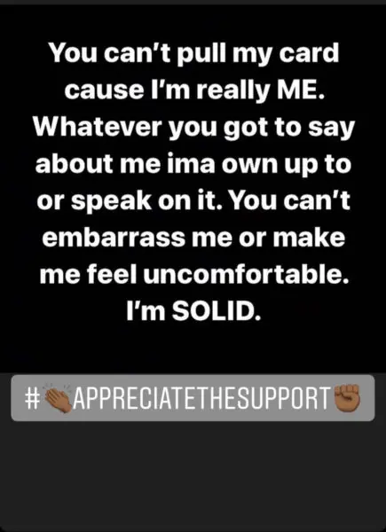 “You can’t pull my card cause I’m really ME. Whatever you got to say about me ima own up to or speak on it. You can’t embarrass me or make me feel uncomfortable. I’m SOLID. #APPRECIATETHESUPPORT.”