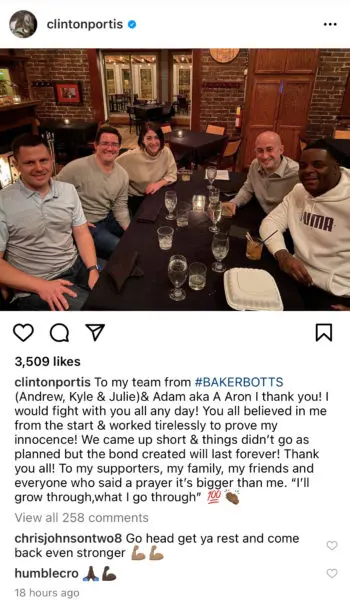 “o my team from #BAKERBOTTS (Andrew, Kyle & Julie)& Adam aka A Aron I thank you! I would fight with you all any day! You all believed in me from the start & worked tirelessly to prove my innocence!”