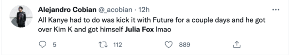 “All Kanye had to do was kick it with Future for a couple days and he got over Kim K and got himself Julia Fox lmao.”