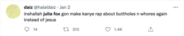 “inshallah julia fox gon make kanye rap about buttholes n whores again instead of jesus.”