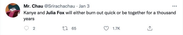 “Kanye and Julia Fox will either burn out quick or be together for a thousand years.”