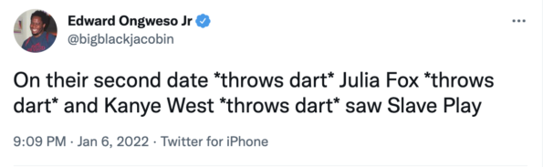 “On their second date *throws dart* Julia Fox *throws dart* and Kanye West *throws dart* saw Slave Play.”