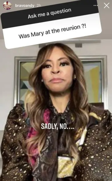 While answering questions on the recently recorded reunion, host, Andy Cohen was asked whether or not Mary Crosby would be present for the reunion, to which Andy responded