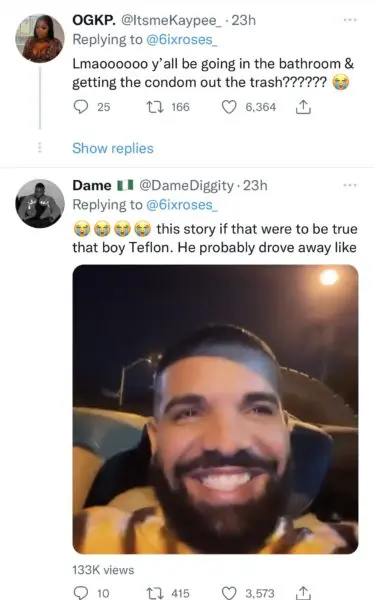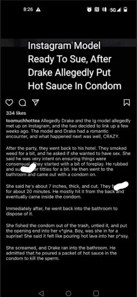 However, she was in for a rude awakening when she discovered something else was inside of the used condom. Drake reportedly admitted that he put a packet of hot sauce into the used condom to kill the sperm. The alleged sauce was hot, and the model apparently said it felt like she had poured “hot lava into her p**sy.” The rumours began surfacing on the gossip Instagram account @TooMuchHotTea, and includes a candid play-by-play description of what allegedly took place. Read the alleged details in the image below: