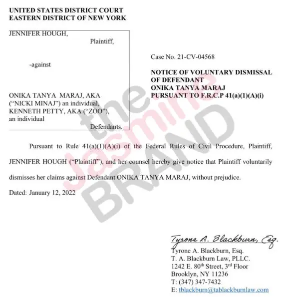 It appears new details have emerged involving Jennifer Hough’s lawsuit against Nicki Minaj. According to reports, Jennifer Hough has dismissed her harassment case against rapper Nicki Minaj. However, the case against Nicki’s husband, Kenneth Petty is still ongoing. In legal documents released Wednesday (Jan.12), it is revealed that the lawsuit against Nicki Minaj has been voluntarily dismissed.