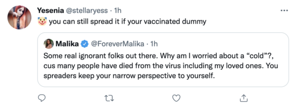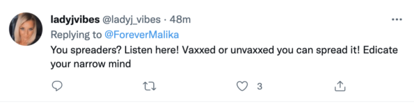 “You spreaders? Listen here! Vaxxed or unvaxxed you can spread it! Edicate your narrow mind.”