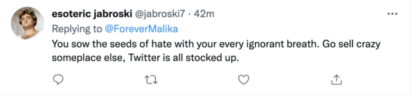 “You sow the seeds of hate with your every ignorant breath. Go sell crazy someplace else, Twitter is all stocked up.”