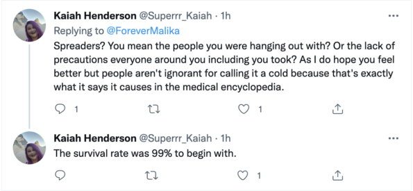 “Spreaders? You mean the people you were hanging out with? Or the lack of precautions everyone around you including you took? As I do hope you feel better but people aren’t ignorant for calling it a cold because that’s exactly what it says it causes in the medical encyclopedia. The survival rate was 99% to begin with.”
