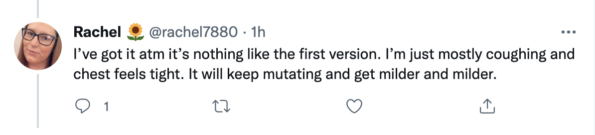 “I’ve got it atm it’s nothing like the first version. I’m just mostly coughing and chest feels tight. It will keep mutating and get milder and milder.”