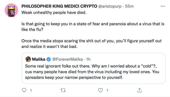 “Some real ignorant folks out there. Why am I worried about a ‘cold’?, cus many people have died from the virus including my loved ones. You spreaders keep your narrow perspective to yourself.”