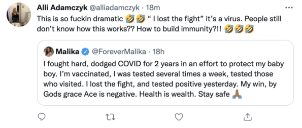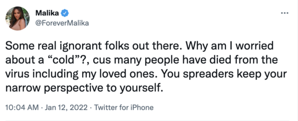 While many of her followers offered their support, others used it as another opportunity to share their stance of COVID being very mild. A few of them compared it to the common cold. Malika responded by tweeting: