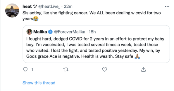 “Sis acting like she fighting cancer. We ALL been dealing w covid for two years.”