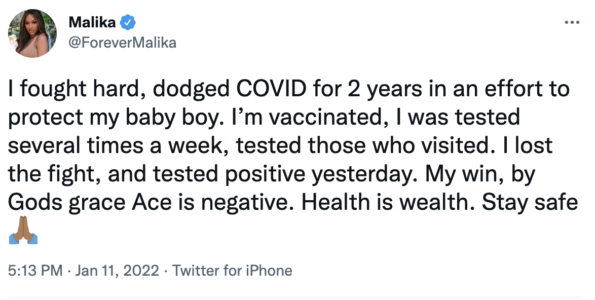 “I fought hard, dodged COVID for 2 years in an effort to protect my baby boy. I’m vaccinated, I was tested several times a week, tested those who visited. I lost the fight, and tested positive yesterday. My win, by Gods grace Ace is negative. Health is wealth. Stay safe.”