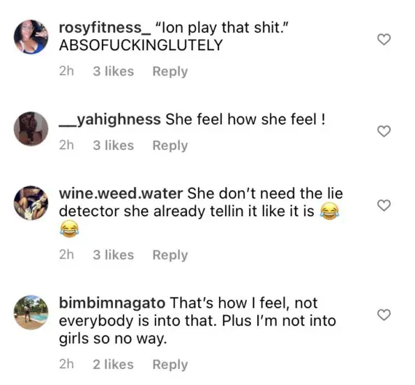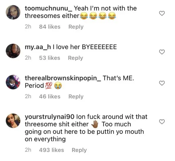 “Not with my man, no… If my life goes how it’s supposed to go and I stay with my man, and he my soulmate like I really think he is. No, I’m going to die never having a threesome. No”