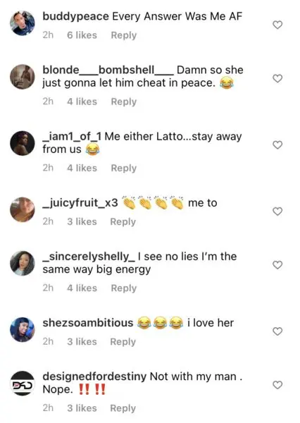 “Yes. Yeah, very jealous. I don’t play that sh*t… I don’t like being in the room, or being near, being friends, being in the same area, whatever- within two feet of anybody my man f*cked before me… Liked a picture before me… DM’d, texted, called, looked at before me.”