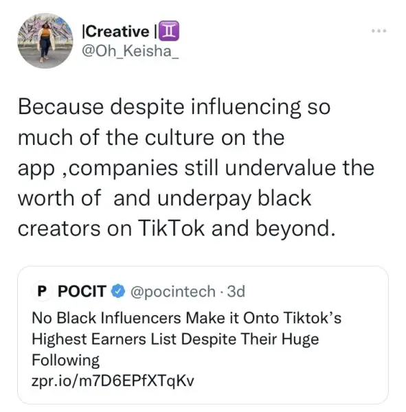 That’s insane that NO BLACK INFLUENCERS MADE IT TO FORBES HIGHEST TIKTOK EARNERS……WHEN ALL TRENDS COME FROM BLACK TIKTOKERS !!!!!! pic.twitter.com/WG9IxTEPBD