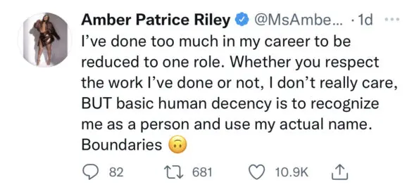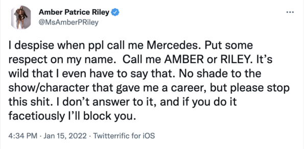 “I despise when ppl call me Mercedes. Put some respect on my name. Call me AMBER or RILEY. It’s wild that I even have to say that. No shade to the show/character that gave me a career, but please stop this shit. I don’t answer to it, and if you do it facetiously I’ll block you.”