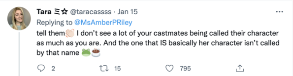 “tell them I don’t see a lot of your castmates being called their character as much as you are. And the one that IS basically her character isn’t called by that name.”