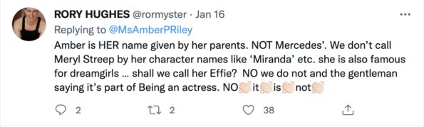 “Amber is HER name given by her parents. NOT Mercedes’. We don’t call Meryl Streep by her character names like ‘Miranda’ etc. she is also famous for dreamgirls … shall we call her Effie? NO we do not and the gentleman saying it’s part of Being an actress. NO it is not.”