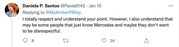“I totally respect and understand your point. However, I also understand that may be some people that just know Mercedes and maybe they don’t want to be disrespectful.”