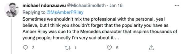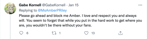 “Please go ahead and block me Amber. I love and respect you and always will. You seem to forget that while you put in the hard work to get where you are, you wouldn’t be there without your fans.”