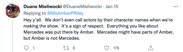 “Hey y’all. We don’t even call actors by their character names when we’re making the show. It’s a sign of respect. Everything you like about Mercedes was put there by Amber. Mercedes might have parts of Amber, but Amber is not Mercedes.”