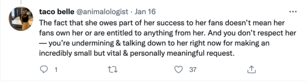 “The fact that she owes part of her success to her fans doesn’t mean her fans own her or are entitled to anything from her. And you don’t respect her — you’re undermining & talking down to her right now for making an incredibly small but vital & personally meaningful request.”
