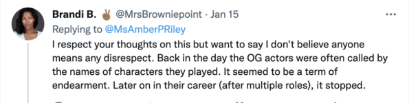“I respect your thoughts on this but want to say I don’t believe anyone means any disrespect. Back in the day the OG actors were often called by the names of characters they played. It seemed to be a term of endearment. Later on in their career (after multiple roles), it stopped.”