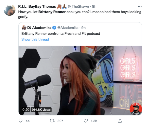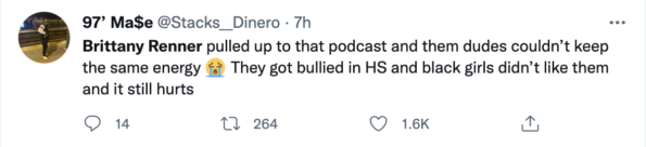 “Brittany Renner pulled up to that podcast and them dudes couldn’t keep the same energy. They got bullied in HS and black girls didn’t like them and it still hurts.”