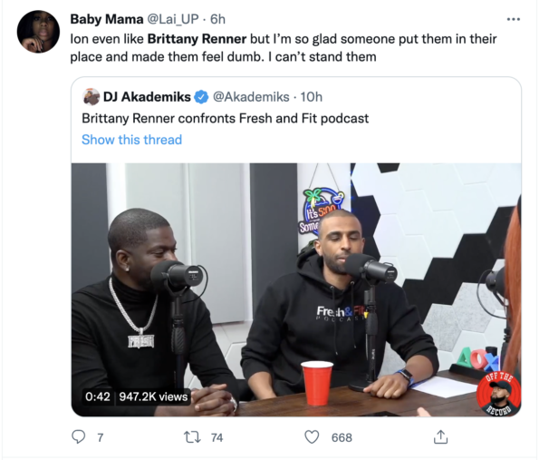 “Ion even like Brittany Renner but I’m so glad someone put them in their place and made them feel dumb. I can’t stand them.”