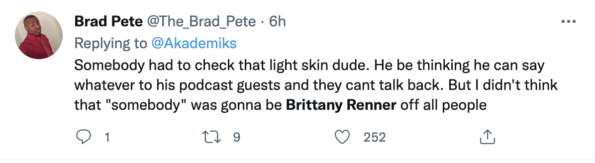 “Somebody had to check that light skin dude. He be thinking he can say whatever to his podcast guests and they cant talk back. But I didn’t think that “somebody” was gonna be Brittany Renner off all people.”