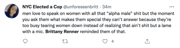 “men love to speak on women with all that ‘alpha male’ sh*t but the moment you ask them what makes them special they can’t answer because they’re too busy tearing women down instead of realizing that ain’t sh*t but a lame with a mic. Brittany Renner reminded them of that.”