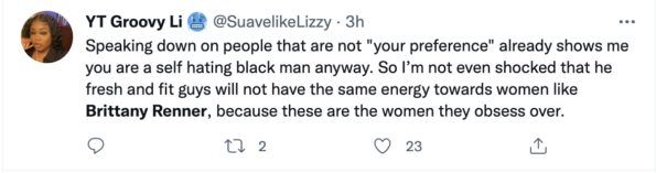 “Speaking down on people that are not ‘your preference’ already shows me you are a self hating black man anyway. So I’m not even shocked that he fresh and fit guys will not have the same energy towards women like Brittany Renner, because these are the women they obsess over.”