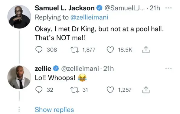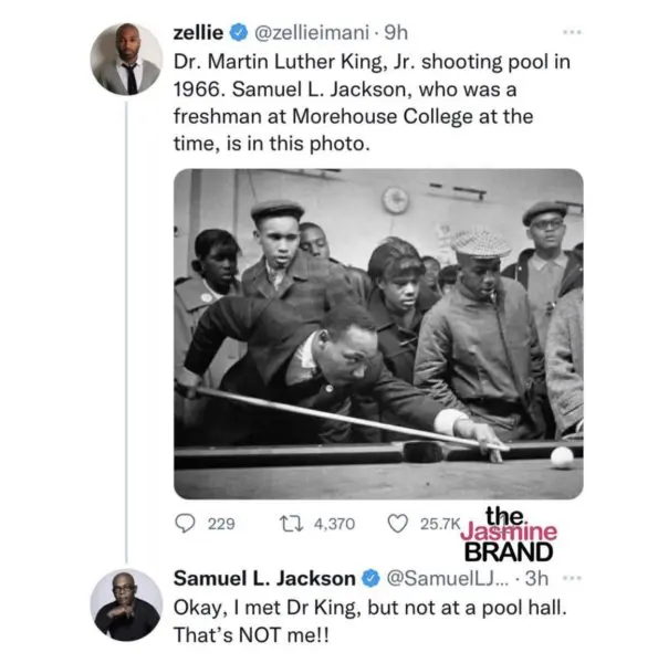 With a career spanning over 30 years, it’s safe to say Samuel L. Jackson is considered Hollywood royalty. While the ‘Pulp Fiction’ star has worked alongside some big names, he’s not going to take credit for cameos he did not make. On Sunday (Jan.23) Black activist Zellie Imani posted an archival photo that allegedly showed a young Samuel Jackson — who was then a student at Morehouse College — observing Dr. Martin Luther King Jr. in a Georgia pool hall in 1966. Jackson caught wind of the image and quickly fact-checked the post. He confirmed that he indeed met Martin Luther King Jr. but confirmed that was not him in the photo. He wrote,