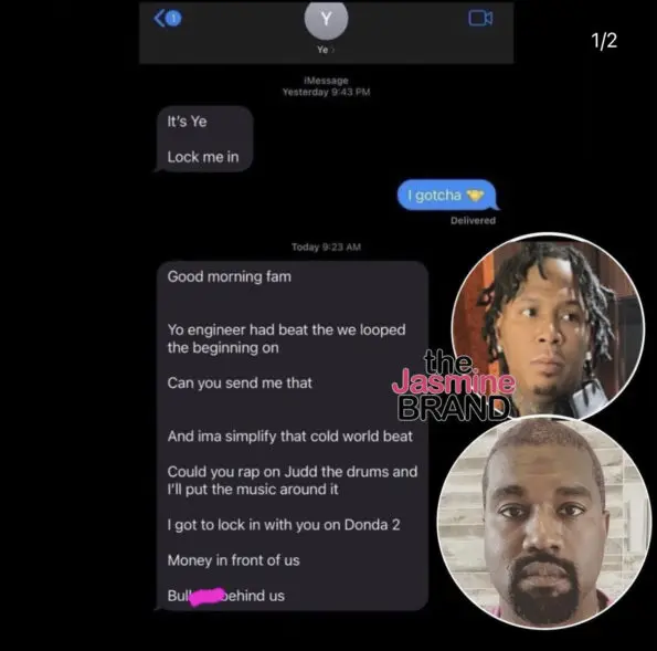 “Could you rap on [just] the drums and I’ll put the music around it. I got to lock in with you on Donda 2. Money in front of us. Bulls*** behind us.”