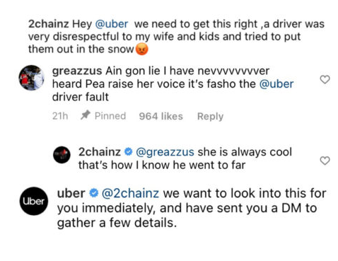 Rapper 2 Chainz says in a recent Instagram post that a “disrespectful” Uber driver tried to put his wife, Keisha Ward and his kids out of the Uber and into the snow.