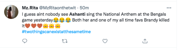 Before the game started today, Ashanti’s mic stopped working so the entire crowd sang the national anthem together. It was absolutely incredible. Rest the day sucked. ? pic.twitter.com/TVygQ8GzS3