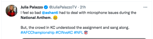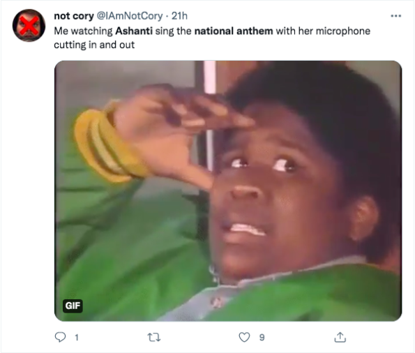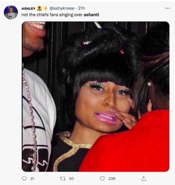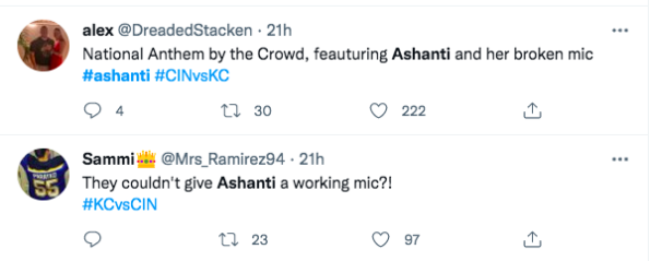 Having your mic malfunction while performing is a nightmare for most entertainers. Over the weekend that nightmare became a reality for Grammy-Award-winning artist Ashanti, 41. On Sunday (Jan. 30) during the AFC championship game between the Chiefs and the Bengals, Ashanti’s microphone stopped working properly while she was singing the national anthem.