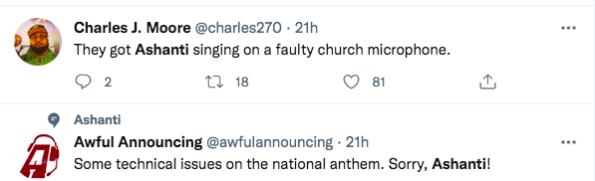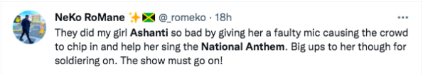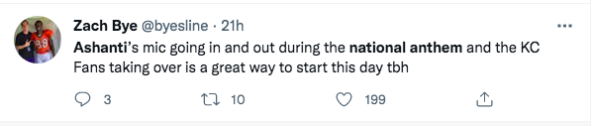 Before the game started today, Ashanti’s mic stopped working so the entire crowd sang the national anthem together. It was absolutely incredible. Rest the day sucked. ? pic.twitter.com/TVygQ8GzS3