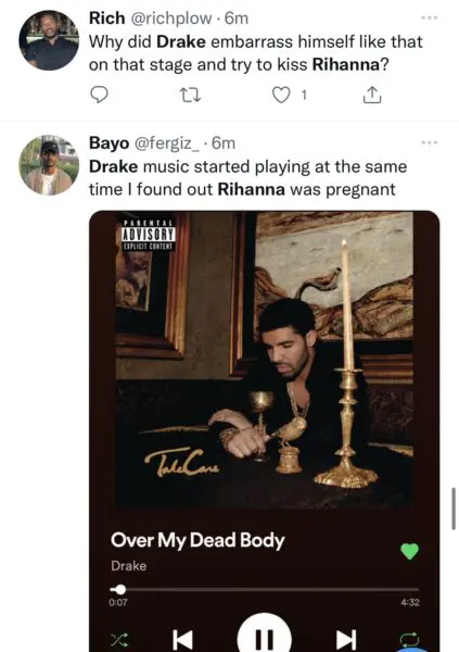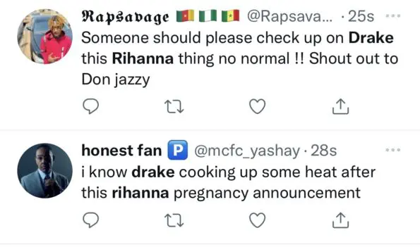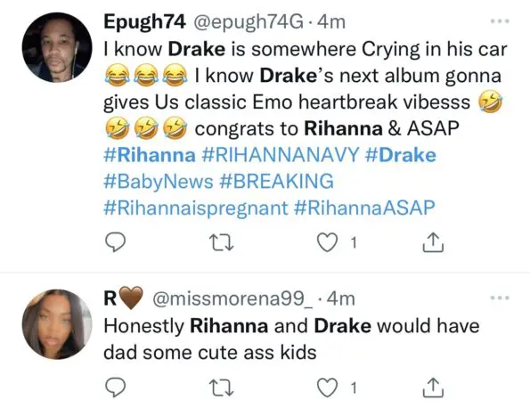 With fans showing love to Rihanna and A$AP Rocky for their big reveal, some have started to question what Rihanna’s ex-boyfriend– rapper, Drake would have to say about this. As a joke, social media users quickly took to Twitter to predict what Drake’s reaction would be to Rihanna’s pregnancy. Many fans predicted that Drake, 35, would be hurt over the news as the Canadian rapper had once publicly professed his love for Rihanna. See reactions below: