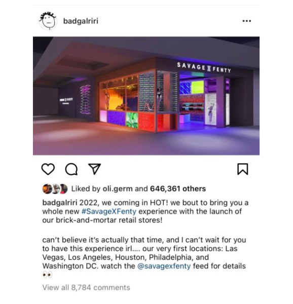 “2022, we coming in HOT! we bout to bring you a whole new #SavageXFenty experience with the launch of our brick-and-mortar retail stores! can’t believe it’s actually that time, and I can’t wait for you to have this experience irl…. our very first locations: Las Vegas, Los Angeles, Houston, Philadelphia, and Washington DC. watch the @savagexfenty feed for details.”