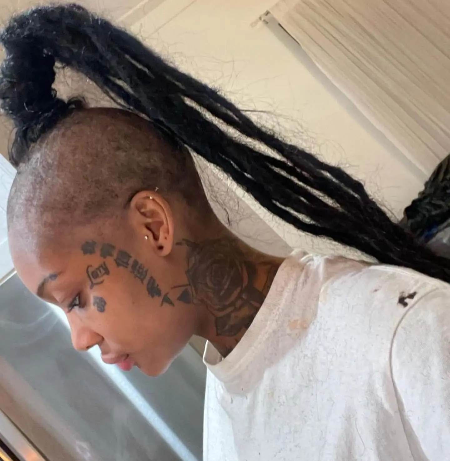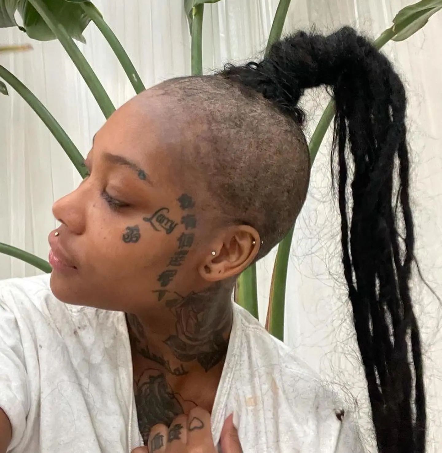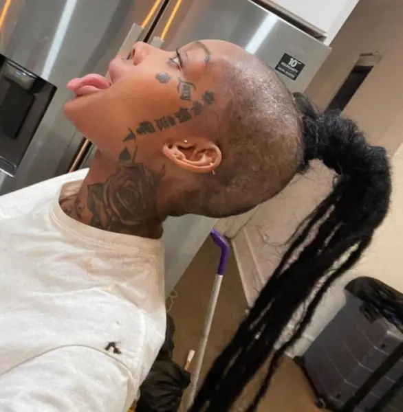 Summer’s new hair style features shaved sides, with faux locs in the center of her head.
