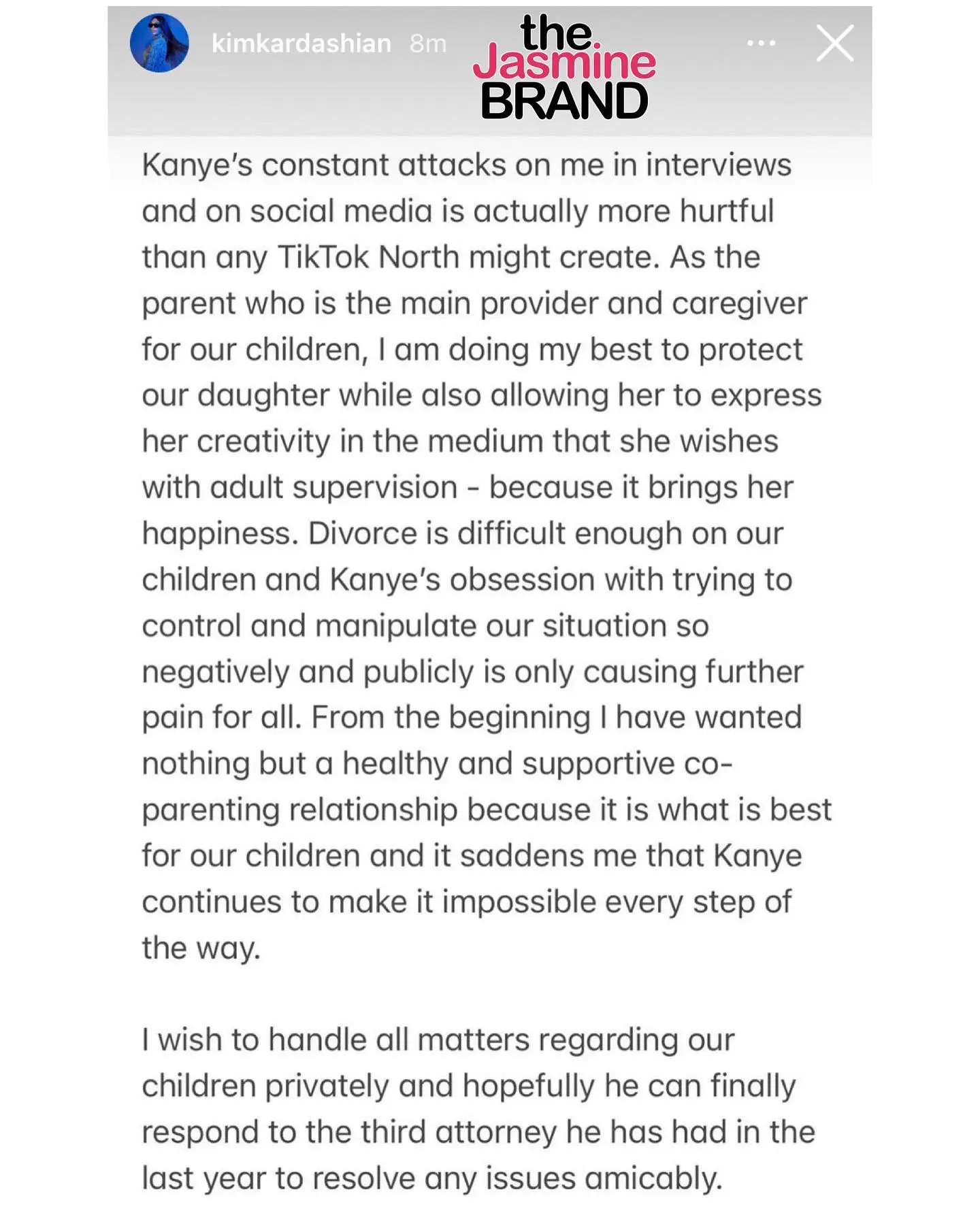 “Kanye’s constant attacks on me in interviews and on social media is actually more hurtful than any TikTok North might create. As the parent who is the main provider and caregiver for our children, I am doing my best to protect our daughter while also allowing her to express her creativity in the medium that she wishes with adult supervision — because it brings her so much happiness.”