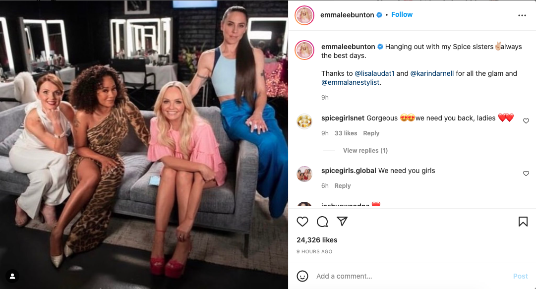 Amid speculation, Emma B (Baby Spice) took to her instagram account to post a picture with Spice Girl members Mel B (Scary Spice), Geri Halliwell (Ginger Spice), and Mel C (Sporty Spice) with the caption: