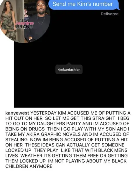 Rapper Kanye West returned to Instagram once again to inform the public about his ongoing battle with soon-to-be-ex-wife Kim Kardashian. This time, Kanye claimed that Kim accused him of orchestrating her murder. Kanye posted a screenshot of a conversation between himself and Larry Jackson, in which he asks the Apple Music head for Kim’s phone number. His explosive rant read: