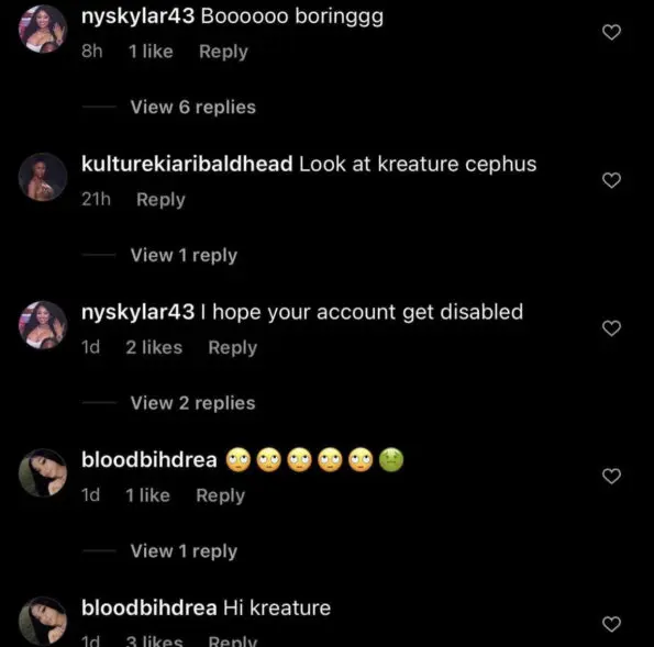 An account named “KultureKiariBaldHead” left a comment that read:
