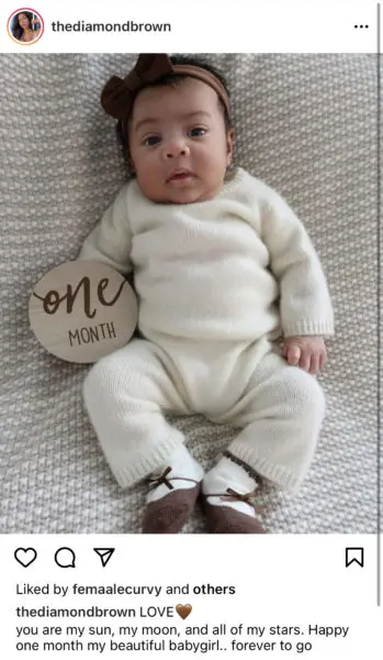 Singer Chris Brown’s alleged baby girl turned one month old today (Feb. 8). Her mother, Diamond Brown, posted a picture to mark the newborn’s milestone. She captioned the photo: