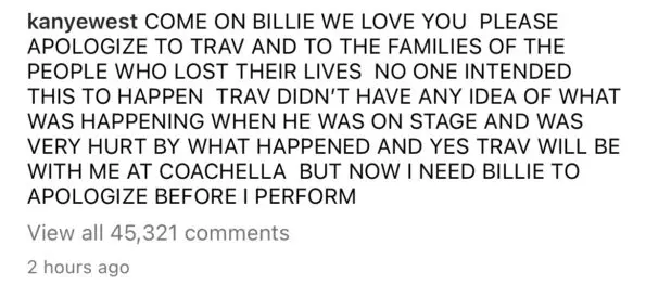 Kanye West then captioned the post stating that while he loves Billie, he thinks she was wrong for allegedly dissing Scott and that she needs to apologize before he performs at Coachella. Kanye wrote,