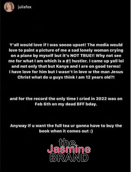 “Y’all would love if I was soooo upset! The media would love to paint a picture of me a sad lonely woman crying on a plane by myself but it’s NOT TRUE!! Why not see me for what I am which is a #1 hustler. I came up yall lol and not only that but Kanye and I are on good terms! I have love for him but I wasn’t in love w the man Jesus Christ what do u guys think I am 12 years old?!”