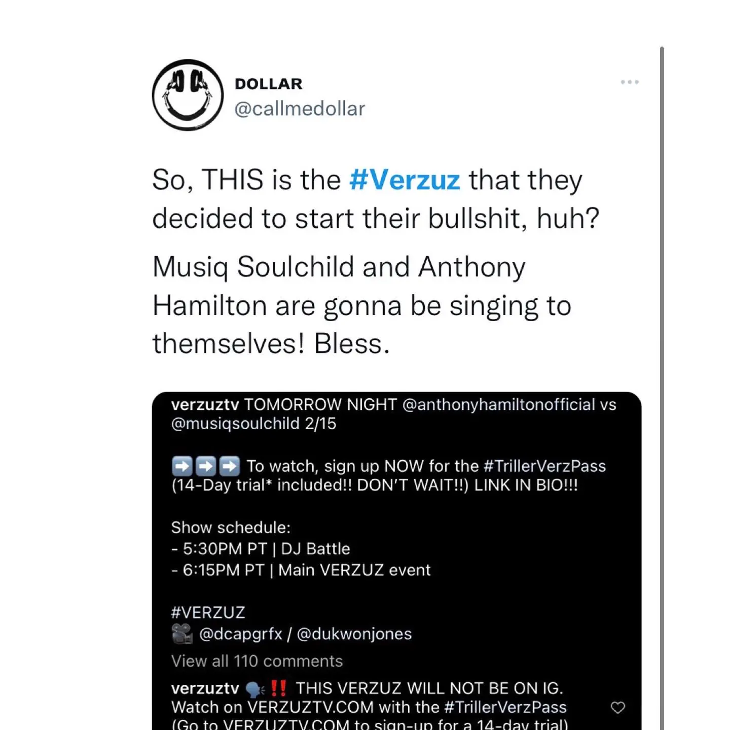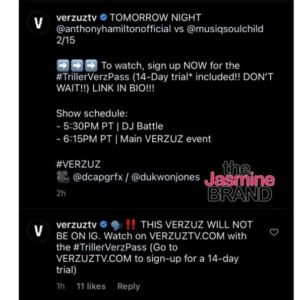 Some fans are upset that the upcoming Anthony Hamilton Verzuz Musiq Soulchild battle will not be on Instagram. Viewers must sign up for a subscription and there’s also a free trial period available.